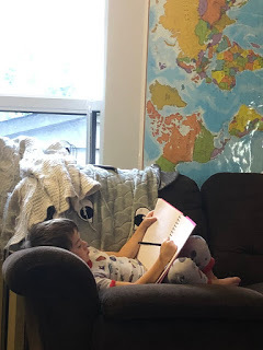 Eli came for a sleepover (before I realized about my eye - hope he's okay.) The boy is a merciless player of games. I'd prefer to read him stories. But we played a long game of Monopoly in which he absolutely crushed me. Hotels everywhere. We played last night, left it set up at bedtime, he woke at 7.30 a.m. raring to get back to it, plotting his purchases. I managed to get him to watch a bit of TVO so I could have a cup of coffee before my total evisceration. And then Go Fish too - he won every game.