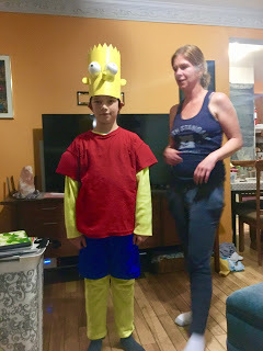 Your smiles for today: The kids are going to do Hallowe'en with friends. Holly and Eli made his Bart costume themselves, with yellow cardboard, styrofoam, and ingenuity.