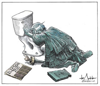 Since I did not, unlike my parents, live through a world war and did not myself experience the massacres in Rwanda or Bosnia or other places, this election is the clearest battle of good versus evil that has touched my own reality in my lifetime. Staring at evil evil evil evil and more evil. Mitch McConnell's repulsive face. And that new woman, I won't even be able to look at her. How did these people without the tiniest speck of conscience or decency or honour come to hold so many millions in thrall?