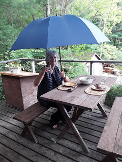 Ruth and I had a wonderful few days. We fell into a rhythm that worked for us both - coffee in the morning sun, reading, discussing politics, reading, internet, swimming, making and eating lunch, reading, aperitif, making and eating dinner, internet, Netflix = perfect. Going down to the lake last night to look at the quarter moon and the electric storm flashing through the clouds on the horizon.
