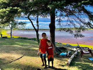 Happy muddy boys at low tide in Nova Scotia - check out the lower half -