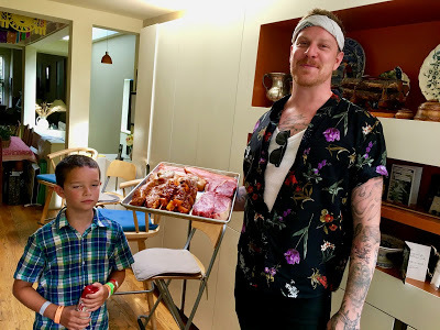 As predicted, Sam cooked an extraordinary meal. I picked mint and basil and he made hors d'oeuvres - prosciutto rolled with mozzarella and mint, tomatoes with mozzarella and basil. He made a salad of quinoa and peppers grilled on the barbie and he grilled pears, zucchini, and carrots with the tops on, all divinely tender and sweet. He caramelized onions for the steak and made a platter of grilled mushrooms in balsamic and wine. And then the meat - marinated chicken, pork shish kebabs, huge steaks, and trout on a plank. (Oh, and while he did that, he made an Instagram Story video about the process and posted it.)