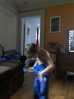 On Friday, across town by TTC - people mostly masked but some defiantly not - to Ben's fifth birthday party with just a few of his friends. Usually Anna has invited half the planet; it's amazing how much easier it is with 4 from one family. There was, however, as always, a delicious meal and then chocolate ice cream cake. I gave Ben a blue ukulele.
