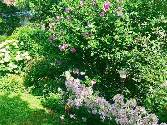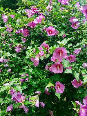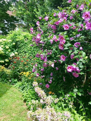 Have hardly been outside my door for days so no photos except, as always, the garden. I know, you've seen it before and you'll see it again, but it's so lovely, I have to keep sharing it with you. The Rose of Sharon - what a showoff! You'll be happy to know that after my efforts at pollination, there is one, count it, one zucchini growing. But as always, cucumbers dropping from the sky.