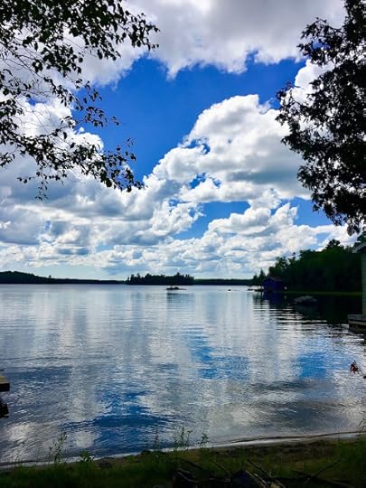 My friend and I had a great time; she has a floating dock that at 5 we loaded up with our aperitif drinks and snacks and then pushed out, like Venetian gondoliers, and sat floating in the lake, jabbering in French and drinking rosé, while the loon family, parents and two babies, dove and sang their quavering song not far away. It was glorious. O Canada. This morning, Monique took her coffee and phone to the dock while I stayed ashore with my camera. And then later took the next shot. The sky!
