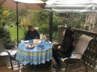 A calculated risk trip to the LCBO for more wine before aperitif with Monique and Cathy, to share my cheese treasure with them. It was raining and Monique did not want to come inside, so we sat on the deck under umbrellas. I drank tea, because I was teaching later.