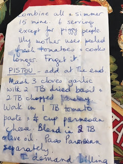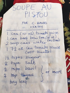 Dear friends Cathy Smalley and Christopher Banks (whom I met when I was a tour guide at the National Art Centre in 1969, the summer it opened), sequestered in Nova Scotia, wrote a few days ago attaching a recipe I gave them years ago. "As you can see by the amount of spillage on every page, this recipe is well used." I'd completely forgotten it but will give it a try soon. Hello to Nova Scotia. We were supposed to be there this summer but now - who knows? Hope to see you soon. Sending love. (PS. I demand billing.)