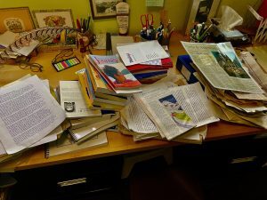 On Wednesday, my front door lock stopped working, so there was a lot of hoo-ha to get it fixed. I’d paid for two writing webinars on Zoom that day but missed part of both as we fiddled with keys. Gleaned a bit of info, especially from Allison Williams on Organizing Your Writing Life, something I need to do. I was recently looking for an article in the big box of student work in my office, ended up taking it all out and marvelling — a huge pile of articles and books by students since the start of my teaching career in 1994. The trouble is, I took all of it out of the box and have not yet put it back.