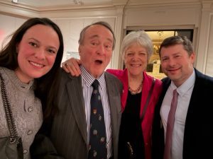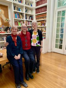 The bus back downtown to nap before the party at the Century Club. Which was wonderful. Cousin Ted is a lawyer mostly for artists of various kinds and knows interesting people all over the world, and Henry is a sweet-natured polymath, so together they have an assortment of fascinating friends. There was schmoozing over cocktails, then a sumptuous dinner. I was sitting with Ted’s sister Susan and her daughter Rebecca and Rebecca’s husband Luke, a money manager whose company has been bought by CIBC, “my Canadian overlords,” he calls them. Susan used to be anxious and thin; now she has Alzheimer’s, is on anti-anxiety meds, and is chubby and serene. Her fulltime caregiver was there with her. Below, Rebecca, Ted, Luke, some beaming Canuck.