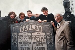 Cousin Ted just sent the photo, below, taken maybe 25 years ago. After my grandfather’s brother Bill’s funeral, we went to the cemetery, and Leo, the youngest brother, (Cousin Ted’s father), said his parents were also buried there, we should try to find their gravestones. We scattered to search, and I was the one who shouted, Here they are! Yetta and Jacob, immigrants from a shtetl near Minsk, who raised 7 children, including Bill, Leo, daughter Belle, and my grandfather Mike, in a small cold water tenement flat on the Lower East Side. Here’s Lola – Belle’s daughter – me, Becky – Lola’s granddaughter whom I just had lunch with at Balthazar in NYC and who lives on the Lower East Side a block from where her grandmother grew up – another relative, and Leo. Invisible here behind Leo is my beloved Uncle Edgar, the world bridge champion.