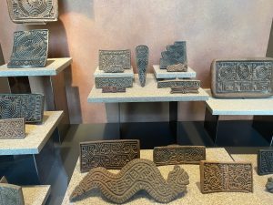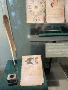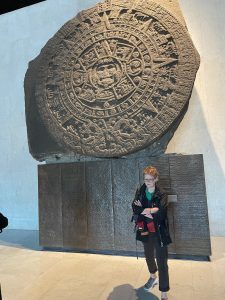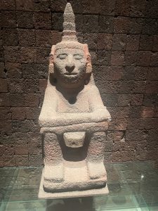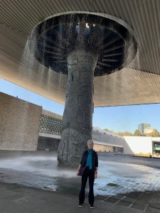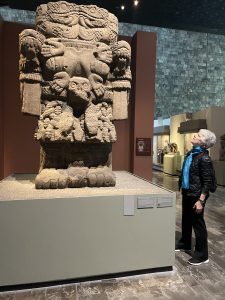 Yesterday, a huge treat — the National Museum of Anthropology. A magnificent building with an exhaustive collection of artefacts illuminating the history and creativity of the Mexican nation, with its many eras, ethnicities, and languages. Beautifully laid out and immensely impressive, especially that these early people carved sacred sculptures of their many gods out of massive hunks of stone – and that somehow those immense creations were moved to the museum. We were in awe. But also the delicacy of other art, pottery, sculpture, and especially for me, the papery Codexes of written records, some in hieroglyphs. An advanced and complex civilization, decimated in the 1500’s by the Spaniards.