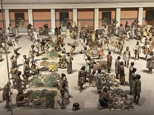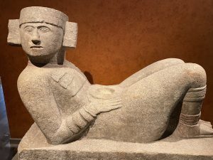 One of the things I couldn’t get over was the similarity in some cultural traditions, despite those cultures being thousands of miles and often centuries apart. Mexicans built stele, big pointed slabs of rock stuck in the ground, like those found all over the world. They made pyramids and filled them with food and treasure for the dead in the afterlife, just as the Egyptians did. One of their foundational myths, we read, is that a flood wiped out all life on earth and the gods had to start again, and that the earth is carried on the back of a turtle. And much else, in this civilization thousands of years ago, in common with every culture on earth: warfare, constant warfare and violence, young men raised to fight and die; class distinction – royalty and the rich, civil service and merchants, peasants. The power of masks, the importance of precious decorative objects, jewelry, gold. The need for drugs like fermented drinks and a supernatural explanation of life and death – here, as in ancient Greece, many gods; for us, only one. The importance of story. Sport, dancing, musical instruments thousands of years old – flutes, drums. And much more.