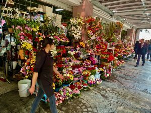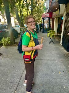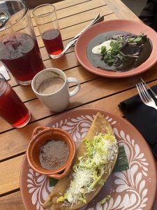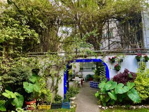 Taxi through unbelievable traffic into the city. Casa Gonzales an oasis, lovely courtyards filled with flowers, birds – a lime tree outside my window. We went out for lunch, found a small local place, sat outside, had tacos and beer – divine. A nap, we were woozy after our early rising. Then I suggested we walk to Chapultapec Park, only it was impossible to get to with a giant highway in the way, unbelievable traffic at rush hour, the air thick with smog. We should have planned the route. So we walked back, wandered in the ‘hood including to a Walmart to get Annie’s special oat milk, then had soup, salad and wine at the hotel, quiet, making friends with Maggie from Boston. All wonderful.