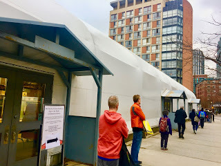 At the market, there were crosses on the sidewalk six feet apart as we waited to get in. That was new. Inside, some vendors were missing, like the marvellous Polish nut lady. But the Mennonite butchers, the Merchants of Green Coffee guy, the sourdough bread people, the Empire apple guy, the leeks and asparagus people - all there. I was happy to support our local farmers and stock up. Wore gloves as much as possible, tried not to touch my face, was in and out quickly, washed my hands as soon as I got home. Imagine - a death-defying, life on the edge trip to the market.