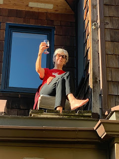 PPS. Lots of comments are flooding in via email and Anonymous writing below, some siding with me, and some with JM. As we sat on different levels chatting tonight, I told Monique about it. "What about people with dogs? They're out all the time. No one is telling them to stay home," she said. I think my dear friend JM exaggerates my level of irresponsibility. Sitting once six feet apart on a friend's deck is not a mad flouting of rules. But he still thinks I'm wild and crazy and leading you all astray.