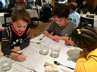 As an antidote, I offer this, my beloved grandsons and their friend Inaya scribbling on the paper tablecloth at the restaurant we ate at before Beethoven. May they have a sane, safe world to grow up in. May they always, always, have a home.