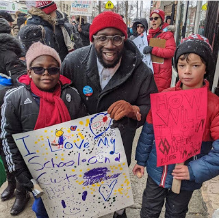 Inaya's poster says "I love my school and cuts hurt me." Eli's says "How will I learn math with 30+ kids in my class?" That's Paul Taylor in the middle, Anna's friend from high school, who ran for the NDP recently and came a close second to the Lib.