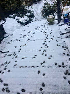 Woke up this morning to this, on the deck - an army of little paw prints, the raccoons checking to be sure I haven't flung the contents of my fridge out for them. Good luck with that, banditos.