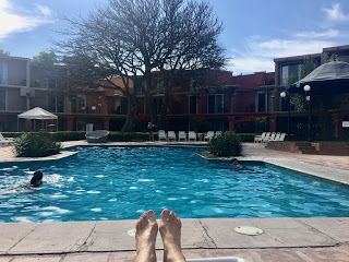 After Madeleine there was an opening reception that I was not invited to; Curtis and I took the Writer's Package, much cheaper than the Whole Enchilada package but with many exclusions. I am starting to wonder if that was a mistake - we are missing a lot of things, could buy individual tickets but they're extremely expensive. However, I'm now sitting in the shade by the pool again while others are inside listening, so nothing to complain about.