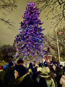 Last night was another double weeper for this sentimental fool. First I went to the annual tree lighting at Riverdale Farm, where Annie’s choir was singing. Luckily, it was a mild night after several very cold days, and the Farm was jammed with kids and parents and everyone else. There were carols and other songs by the large choir standing outside one of the barns, including Jingle Bells sung by cats and dogs; then we counted down, and the giant tree burst into light. Misty tears. As always, I marvel a neighbourly down home scene like this is taking place in the heart of a metropolis.