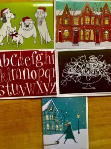 Yesterday afternoon, to Alanna’s open house in her fab condo, where she sells her prints and cards. She is a major talent, this woman. I bought a bunch of her lovely cards, though they can’t be sent until the mail strike ends.