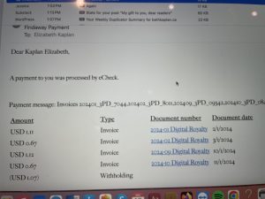 The good news is that I keep getting fat royalty cheques for various projects, including this one from Findaway Voices, an alternative to Audible, which has my audiobook for Loose Woman: