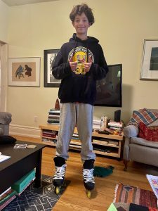 #9 – the Beatles would approve – standing beside the coach. As Lani wrote, “That boy sure is a tall drink of water.” The slightly too big skates I gave him last Xmas are too small.