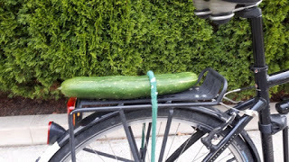 And then dinner at the pub across the street, as usual. Ken has lost two dear friends recently and is, he says, sick of death. But we cheered each other up. I gave him a magnificent cucumber, one of three fresh picked today, that he found a way to transport home on his bike.