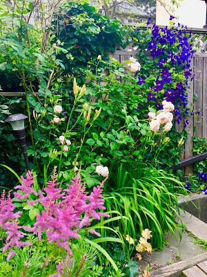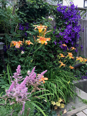 I used not to understand cottage people who load up the car, sit in ghastly traffic for hours on the weekend, get to the cottage, unload, try to relax, load up the car and drive in ghastly traffic home. But Ruth stays for weeks at a time; her cottage has high-speed wifi, Netflix, tons of books and magazines, and a clear, quiet lake. I felt ten years younger when I got back.This greeted me - the clematis and the astilbe have gone mad, and the roses are as glorious as ever.