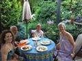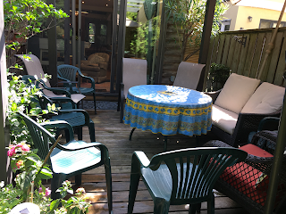 Yesterday, a gathering here of runfit friends, the group of us who've been going around in circles together on Wednesdays for years, led by our inspiring Carole, the marathon-running grandmother of three adults who looks no more than 50. We had a potluck feast on the deck and got to know each other a bit better, as we have only the briefest of conversations as we puff and sweat. It's thanks to Carole that we're all even a little bit fit, though I least of all, the slowest of the bunch. And yet, as we always say in the gym, we're here. The miracle is, we're here.