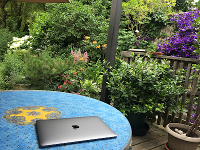 Sitting here in front of the fan with the AC on too, at last - it's brutally hot outside with a storm predicted, a blessing for the garden. We're still clicking happily together, my new Mac and I, though it does something annoying; it likes to add periods before I do, before I've finished writing, as if it's editing me mid-sentence. Have to figure out how to stop that; it's bad enough with human editors cutting us to bits without machines doing it too.