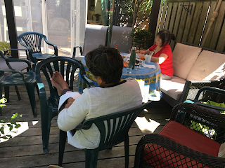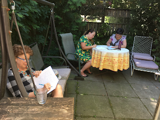 Immediately, of course, there was the computer to deal with, letters to write for Karen, much email to tend to on my phone, garden, groceries, kids. Students, editing clients, friends. Last night, a wonderful evening - last year's CNFC conference committee, minus only Pam, came for dinner on the deck.