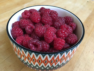 This morning I awoke to a brand new pimple on the side of my face and had to scrabble about for the Clearasil. The Clearasil. I'm going to be 69 in two weeks, and still with the pimples. Is that fair?But the good news: my raspberries are overflowing. In all these years, this is the first time I've had a bowlful, with more to come.