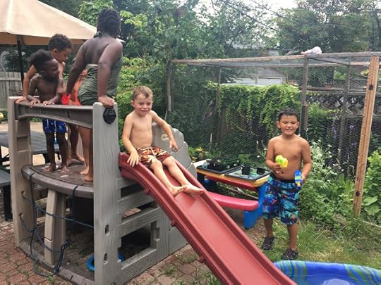 I escaped from the party to my friend Lynn's; she has a shady, plant- and tree-filled backyard, a forest glade with a wonderful pool like a tiny lake. We floated and chatted for an hour before emerging for rosé and supper and a second swim. I can feel that cool water on my skin even now. Wish I could create a tiny lake in my own yard; the summers are not going to get cooler. Maybe I'll get my own wading pool, and a slide too.