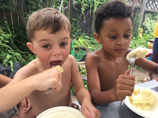 Supper - the garden's cucumbers are beginning to pile up, so creamy cucumber salad. Fresh corn with lime. Salmon. Peaches. Rosé. Summer! Thank you.