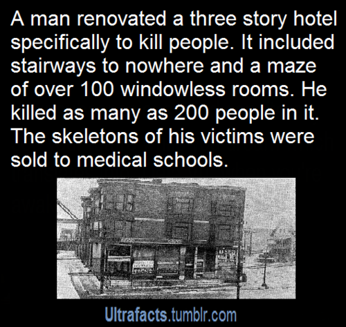 Herman Webster Mudgett (May 16, 1861– May 7, 1896), better known under the alias of Dr. Henry Howard Holmes, was one of the first documented American serial killers in the modern sense of the term. In Chicago at the time of the 1893 World’s Fair, Holmes opened a hotel which he had designed and built for himself specifically with murder in mind, and which was the location of many of his murders. While he confessed to 27 murders, of which four were confirmed, his actual body count could be as high as 200.He took an unknown number of his victims from the 1893 Chicago World’s Fair, which was less than two miles away, to his “World’s Fair” hotel.
