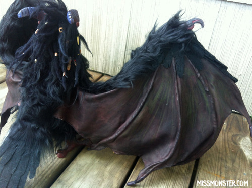 This is one of the most complicated and time consuming dolls I have made so far! This is a one of a kind piece with articulated wings, head and legs. The wings are made from leather, the body is faux fur. The body is soft and stuffed with polyfill over an armature. Her head, claws, breasts and feet are cast urethane that has been had painted and tinted. The urethane used is slightly translucent giving her a warm realism in certain lighting.