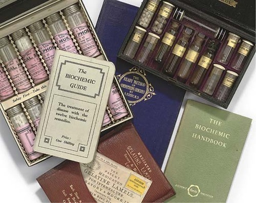 entitled The New Era Biochemic Set, produced by The New Era Treatment Co. Ltd. Cecil House, Holboln Viaduct, London E.C.1, with advice on inside of lid from the ‘Biochemic Calendar’, containing twelve screw-top bottles of medicine with pink paper labels, in a leatherette-covered case — 15.9 x 18.8cm. (6¼ x 7 3/8in.) with accompanying ‘Biochemic Guide’ and separate ‘Biochemic Handbook’; a late 19th-Century case of medicines designed by DR E.A. KIRBY., the leatherette-covered case with velvet lining, fitted to contain eight phials with cork stoppers with ivorine tops and gilt paper labels and four small bottles with ground stoppers (one missing) with similiar labels, a glass container and two small paper pill boxes — 16.3 x 10cm. (6 3/8 x 3 7/8in.) and an associated handbook; and a mid 19th-Century red leather wallet of MEDICATED GELATINE LAMELS by Savory & Moore, Ltd., LONDON, containing eleven packets of medicine in gelatine lamel form with instructions for each and a booklet of recommended doses and uses for medicine.