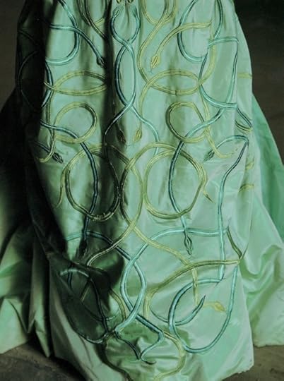 "I made Lucy’s sexy party dress with the snake embroidery peppermint green to match Mina’s green dress. Young girls, when they are friends, often dress similarly. At the same time, I wanted to show how different they were - Lucy a wealthy aristocrat, and Mina from a middle-class family; Lucy a sexually liberated girl who turns into a vampire, Mina prudent and modest. …I used a leaf pattern for Mina’s dress to symbolize peace and intertwining snakes for Lucy’s dress to symbolize eroticism." (Coppola and Eiko on Bram Stoker’s Dracula, p. 54)