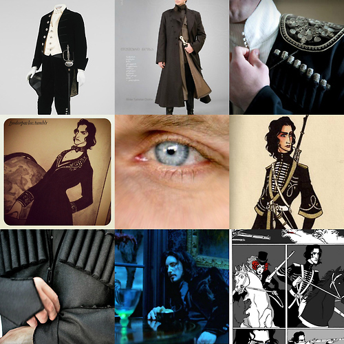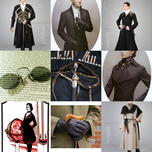 When traveling in the outside world, Iosef dresses to match the style of the lands he is visiting. In mid and late 19th Century Europe, this entails a three-piece suit with a frock coat and a cravat. However, his coats are often cut to hand at or below the knee, in a manner similar to the chokha. His European clothing often incorporates more embroidery and detailing than is common, though it is always tasteful.