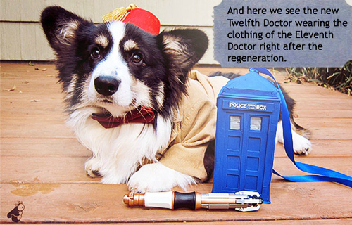 “And here we see the new Twelfth Doctor wearing the clothing of the Eleventh Doctor right after the regeneration.”