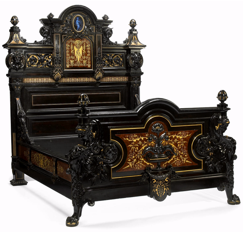 An American Renaissance Revival parcel-gilt, carved, inlaid and ebonized bedstead. Herter Brothers, New York, c. 1872.