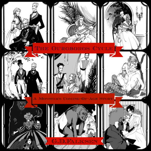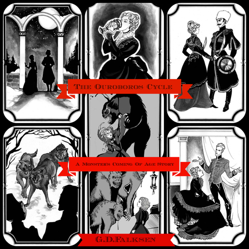 The Ouroboros Cycle, Book 1: A Monster’s Coming of Age Story is my latest book out. Here is some of the wonderful art in its pages shown in the collages above. It can be picked up in print and ebook at Wildside ,Amazon , Barnes & Nobel and Kobo as well as where ever else books are sold.