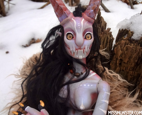 Eusapia will come with her (faux) fur traveling cloak and necklace. She will be shipped strung in a cloth bag ( and padding of course) with a small monster face medallion marking her as one of my original artist dolls. Please treat her with care and gently wipe with a slightly damp cloth if she gets smudged or dirty.