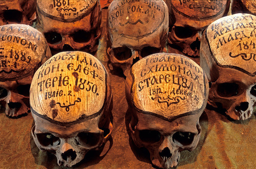 Dated skulls, Romania - The skulls in the ossuary of the 15th century Neamt Monastery bear little texts stating the names and dates of the monks. Photo Mick Palarczyk.
