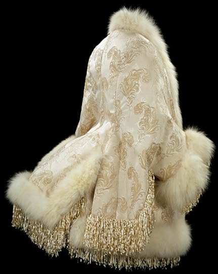 A jacket from 1885 made of silk and velvet with a quilted satin lining, trimmed with arctic fox fur and silk chenille fringing. The design, which perfectly complimented the exaggerated bustles of the period, combined with the mixture of expensive materials would make this jacket the height of fashion and luxury.
