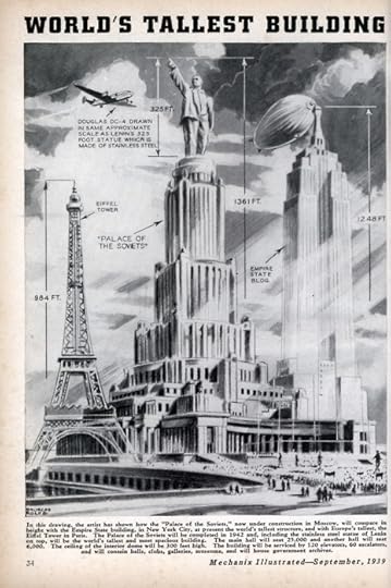 Page from September 1939 edition of Mechanix Illustrated. It depicts the projected "Palace of the Soviets," an administrative centre intended for Moscow. Building began in 1937, but the project was abandoned when Germany invaded in 1941. The design was based on a submission to an architectural competition by Boris Iofanan. It was ostensibly judged by a "Council of Experts" chaired by Gleb Krzhizhanovsky, but Stalin appears to have had a hand in the final decision on, and indeed design of, the neoclassical "wedding-cake style" structure. If completed, it would have been the tallest building in the world.