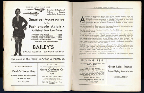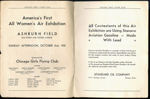 This is an incredibly rare 1932 program from “America’s First All Women’s Air Exhibition” featuring cover art of a fresh-faced aviatrix looking skyward by noted pin-up illustrator Earl Christy. The event was hosted by the Chicago Girls’ Flying Club and was a huge hit. During the Golden Age of Aviation, the era between world wars, the public was fascinated with flight, making air shows huge draws. From barnstorming to wing walking, aerobatics and dangerous stunts, the country was just plane crazy and couldn’t get enough of these spectacles.