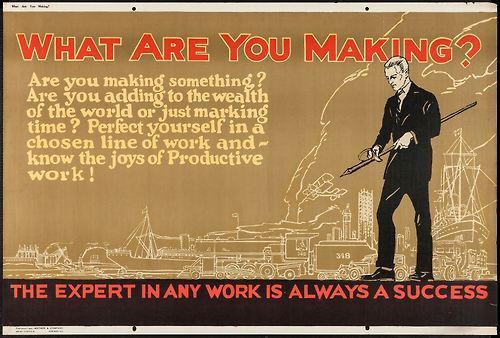 'What are you making?' poster from Uncouth Reflections. The man in a suit appears to be whittling a Punji stick.