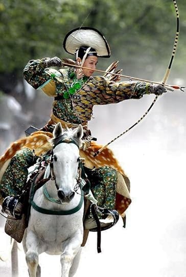 An archer dressed in traditional samurai garb displays Yabusame (archery while on horseback). Japan. Image via Pinterest